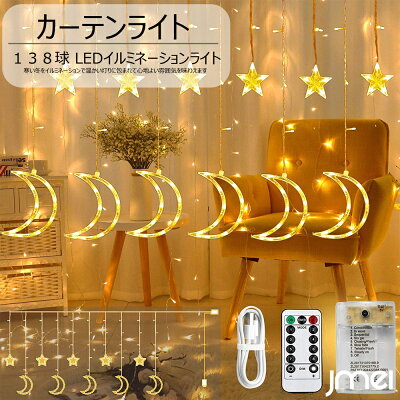 イルミネーションライト 138球 星 LED カーテンライト スター ムーン つらら 月 ストリングライト リモコン付き USB式 電池式 二重電源供給 8種類 点灯モード タイマー付き IP67 防水仕様 クリスマス 冬 室内 野外 パーティ 結婚式